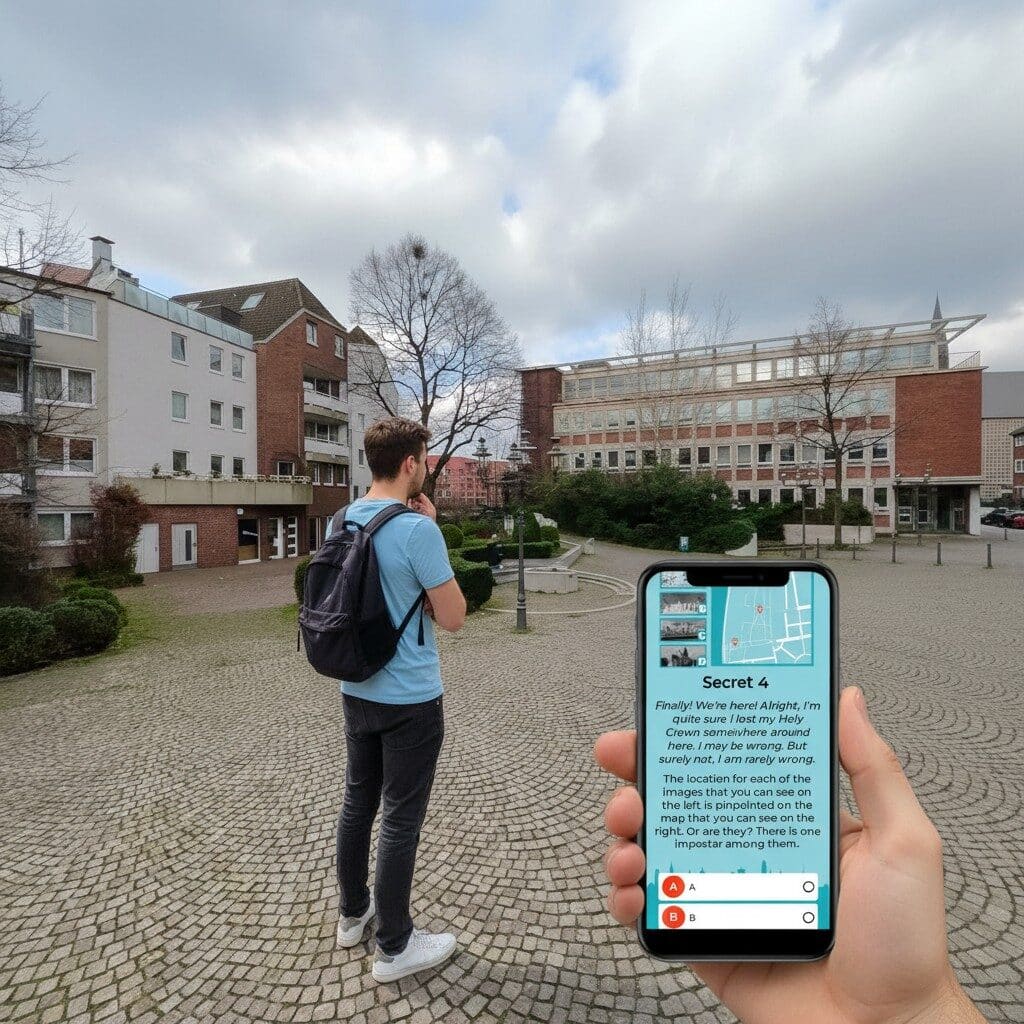 After booking, you’ll receive an email with your play link and simple start instructions. On the day you want to play, just head to the start location at Duisburg, Alter Markt, open the link on your smartphone and begin the game. From there, you simply follow the GPS route, complete the challenges and explore at your own pace.